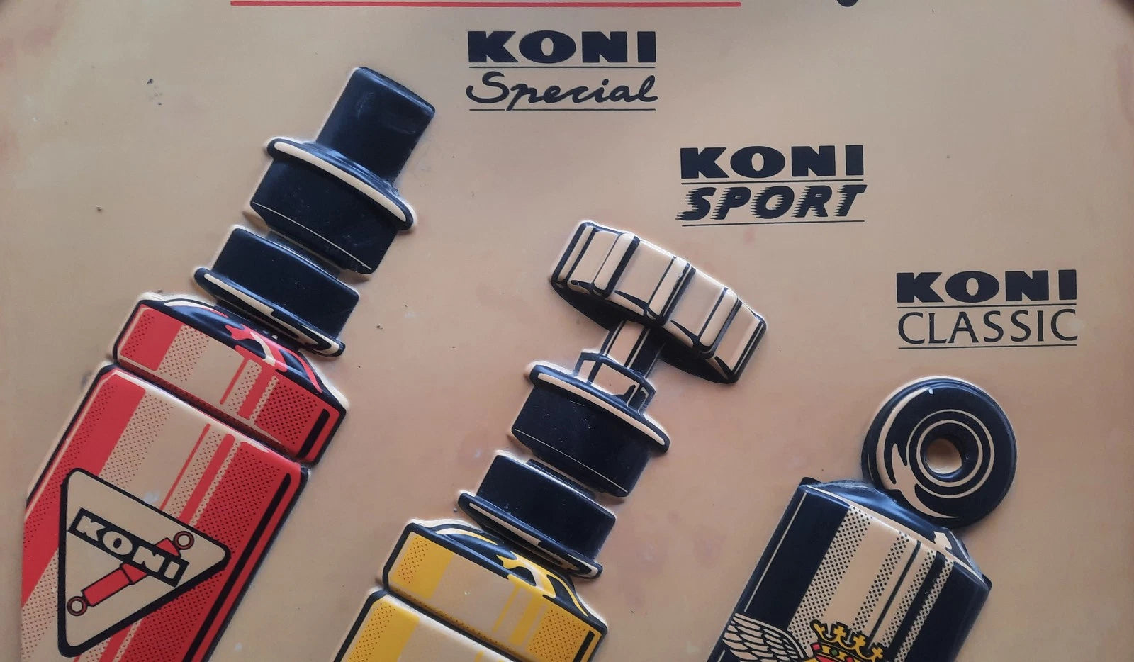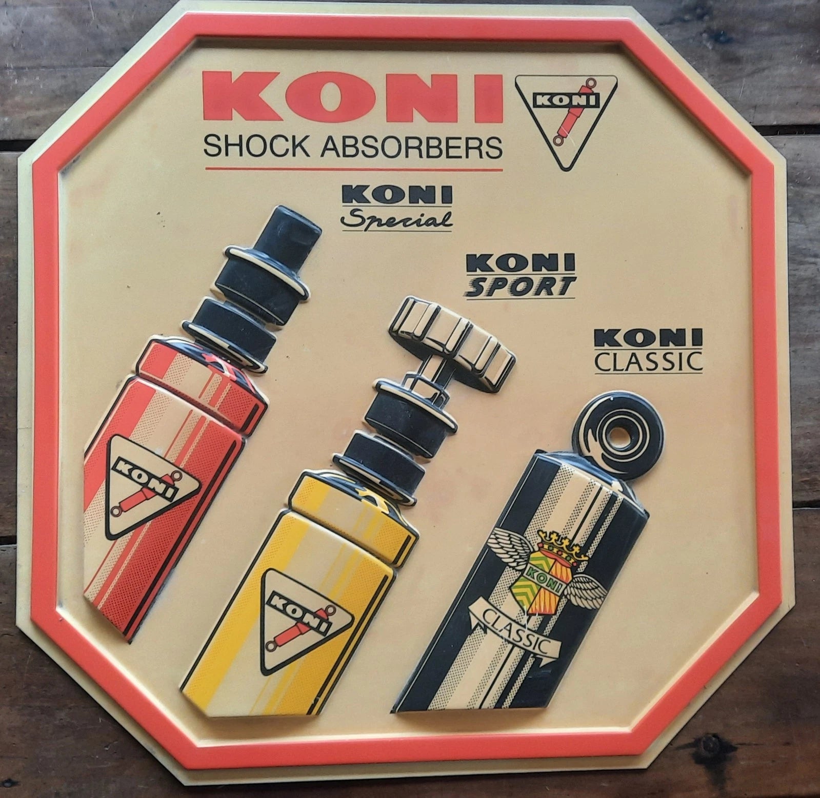 Ancienne Enseigne plastique thermoformé AMORTISSEURS KONI sport automobilia 69x69cm